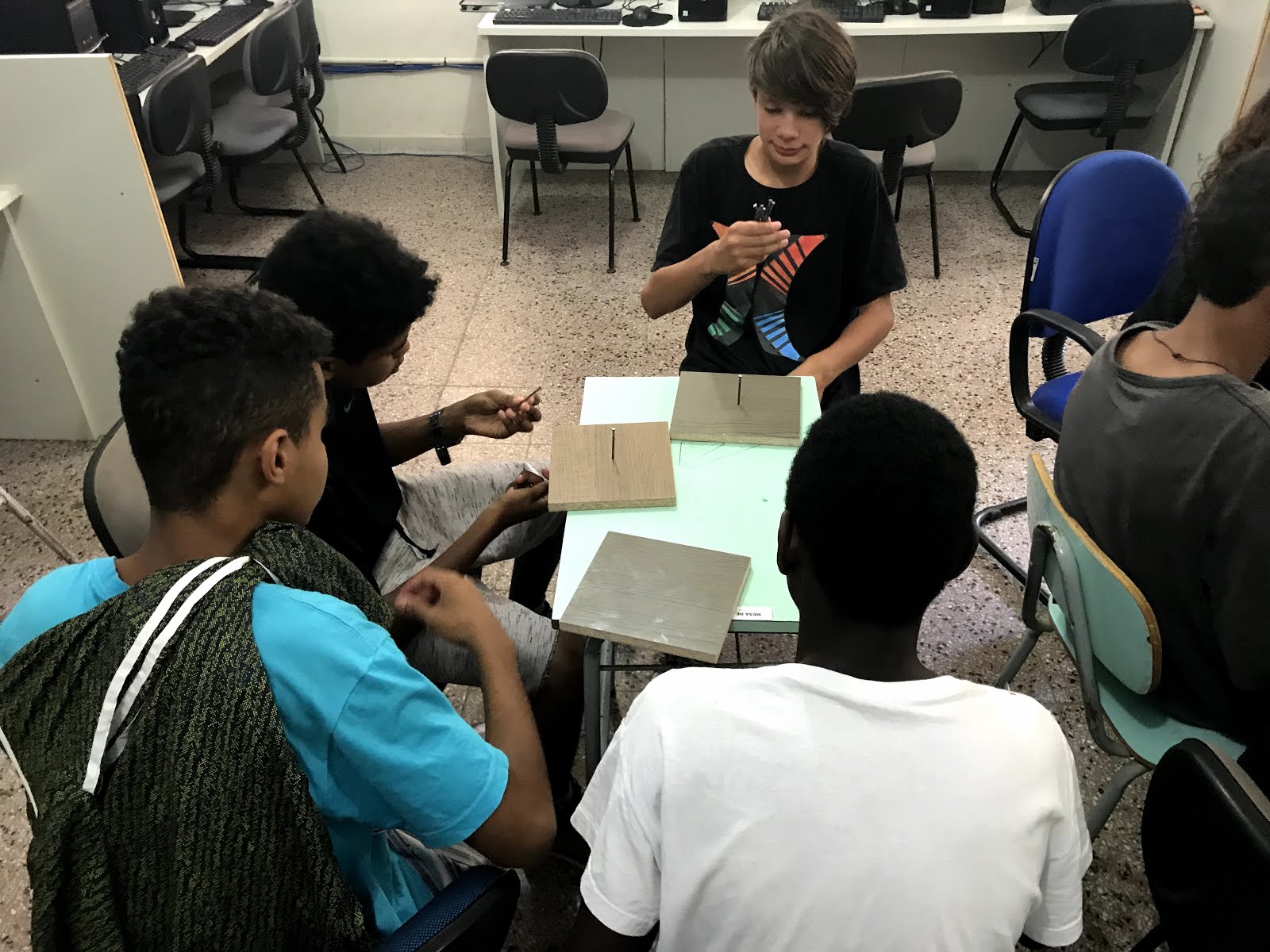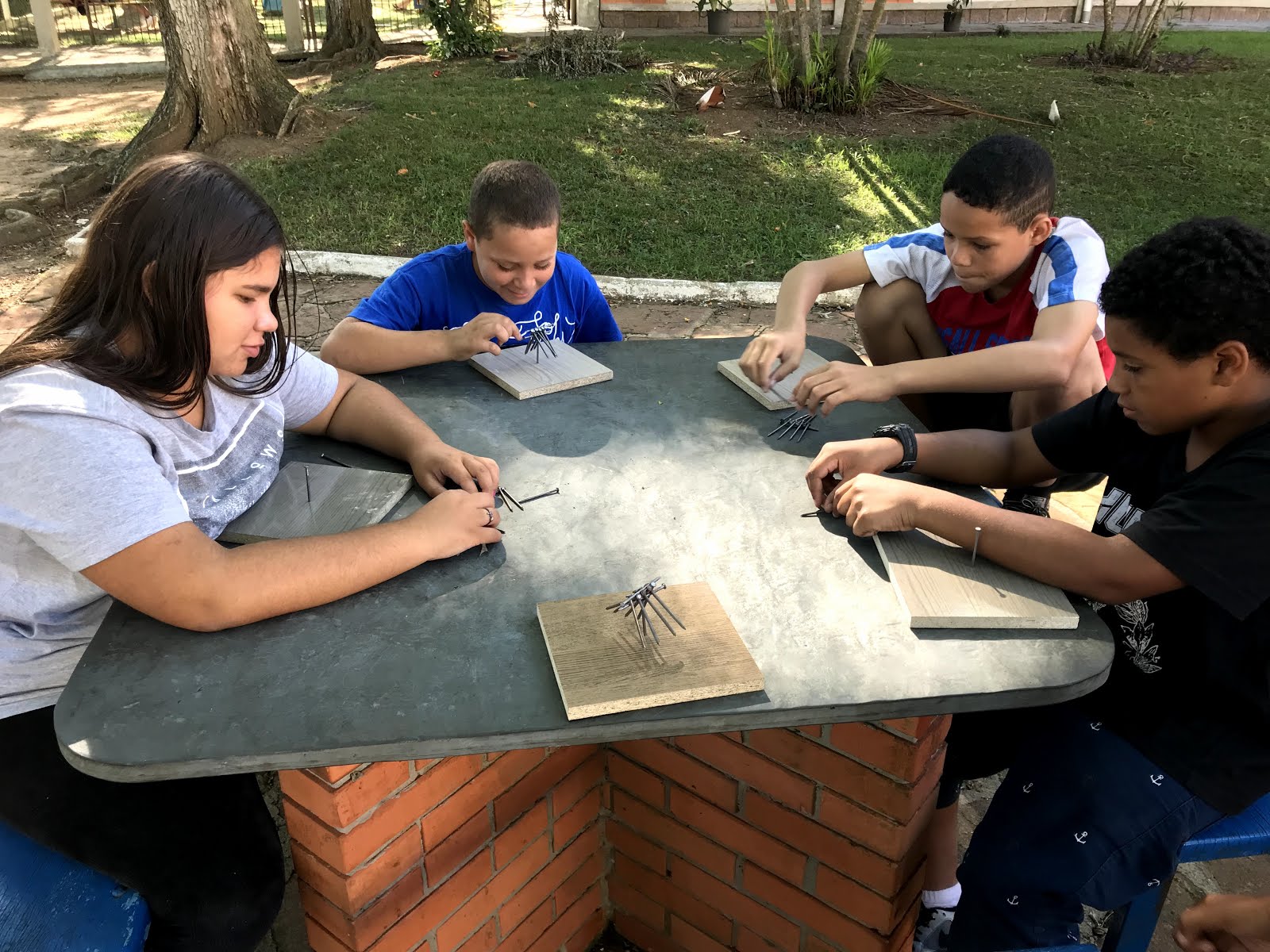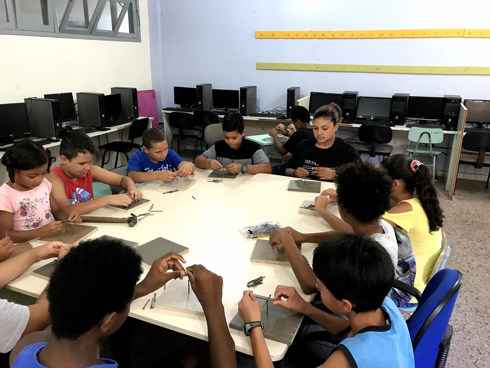 A primeira tarefa era pregar o prego em um pedaço de madeira. Neste momento, muitos aprenderam a usar o martelo e conseguiram aprender como resolver o desafio.