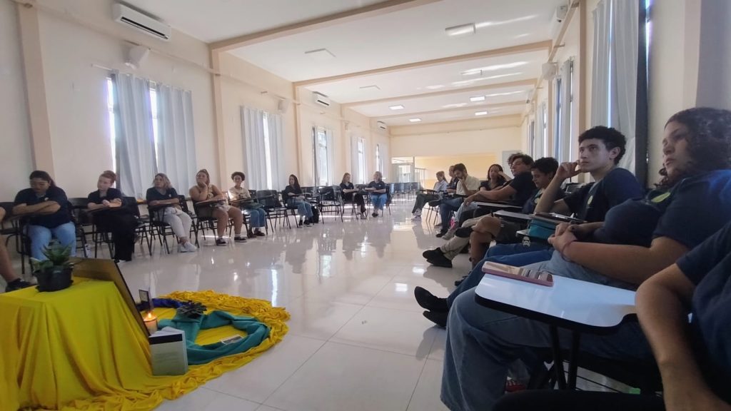 Refletimos sobre o “ver” como a capacidade de perceber com intencionalidade, indo além do olhar superficial. No gesto de “inclinar-se”, destacamos o cuidado com o outro e a presença que se faz próxima. Ao abordar o “sacudir suavemente”, compreendemos o gesto como um verdadeiro despertador, que provoca e motiva. No gesto de “reconhecer”, trabalhamos tanto a dimensão intrapessoal quanto interpessoal, dialogando sobre a construção de relações mais conscientes e respeitosas. Por fim, o “acolher” foi retomado como prática cotidiana, oferecendo a oportunidade de olhar a vida com esperança e construir na solidariedade um mundo mais fraterno.
